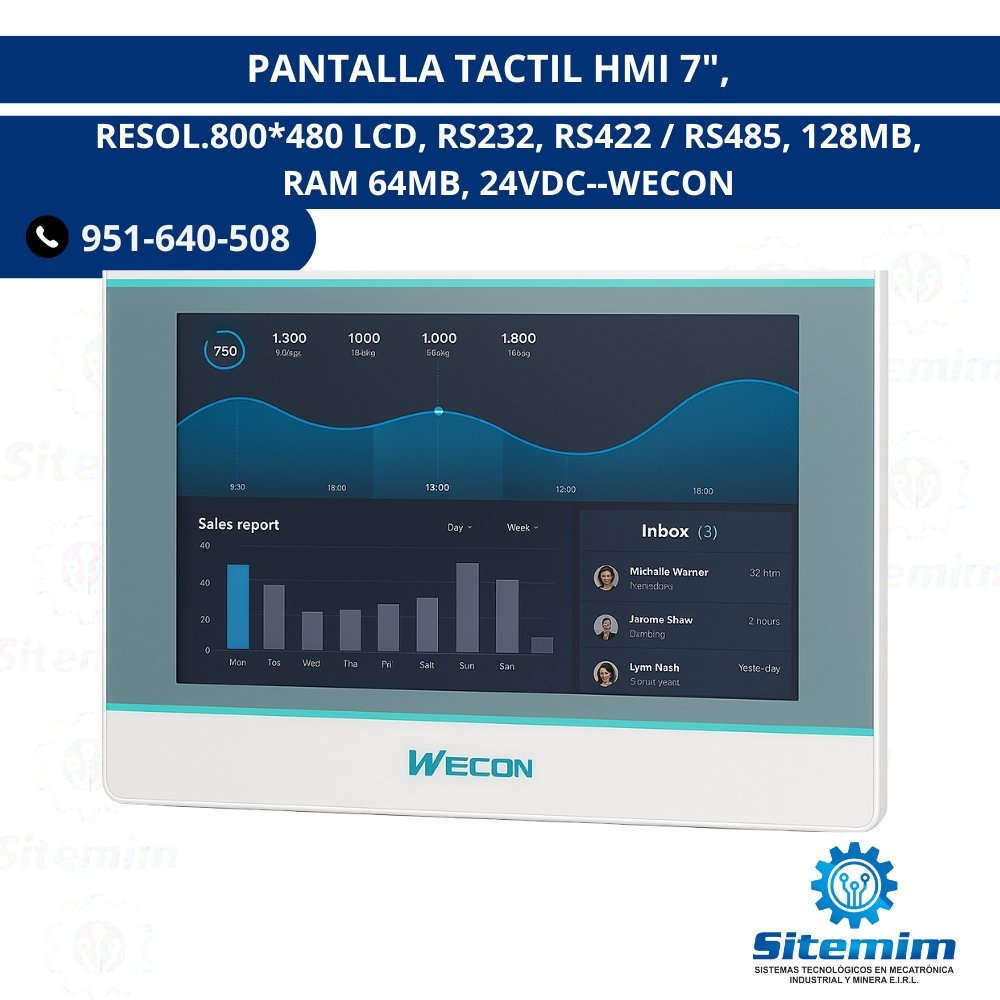PANTALLA TACTIL HMI 7″, RESOL.800*480 LCD, RS232, RS422 RS485, 128MB, RAM 64MB, 24VDC WECON